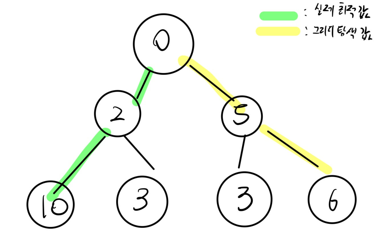위 그림의 트리에서 최댓값 탐색을 한다고 할 때, 실제 최적값은 2 - 10 선택을 통한 12이지만, 그리디 알고리즘은 각 단계별 근시안적인 선택을 하기 때문에, 5 - 6 선택으로 11의 값을 도출한다. 이러한 그리디 알고리즘의 특성 때문에 후술할 두가지 조건을 만족해야만 문제 해결 도구로 그리디 알고리즘을 채택할 수 있다.