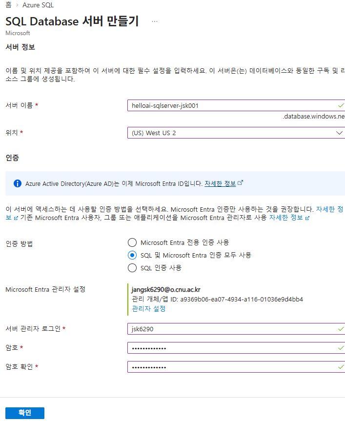 Azure SQL 서비스는 "혼합 모드" 인증을 강제한다. 배포 시 SQL 인증으로 서버 관리자를 생성한다.